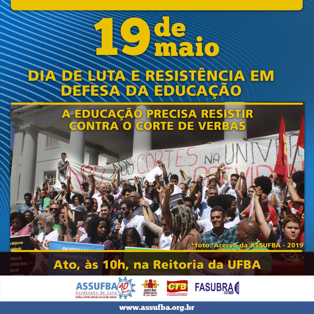Na quarta-feira (19/05), a ASSUFBA participa do “Dia de Luta e Resistência em Defesa da Educação”. Estão programadas mobilizações contra o governo Bolsonaro por todo o Brasil. Em Salvador, o Sindicato realiza ato, às 10h, na Reitoria da UFBA.