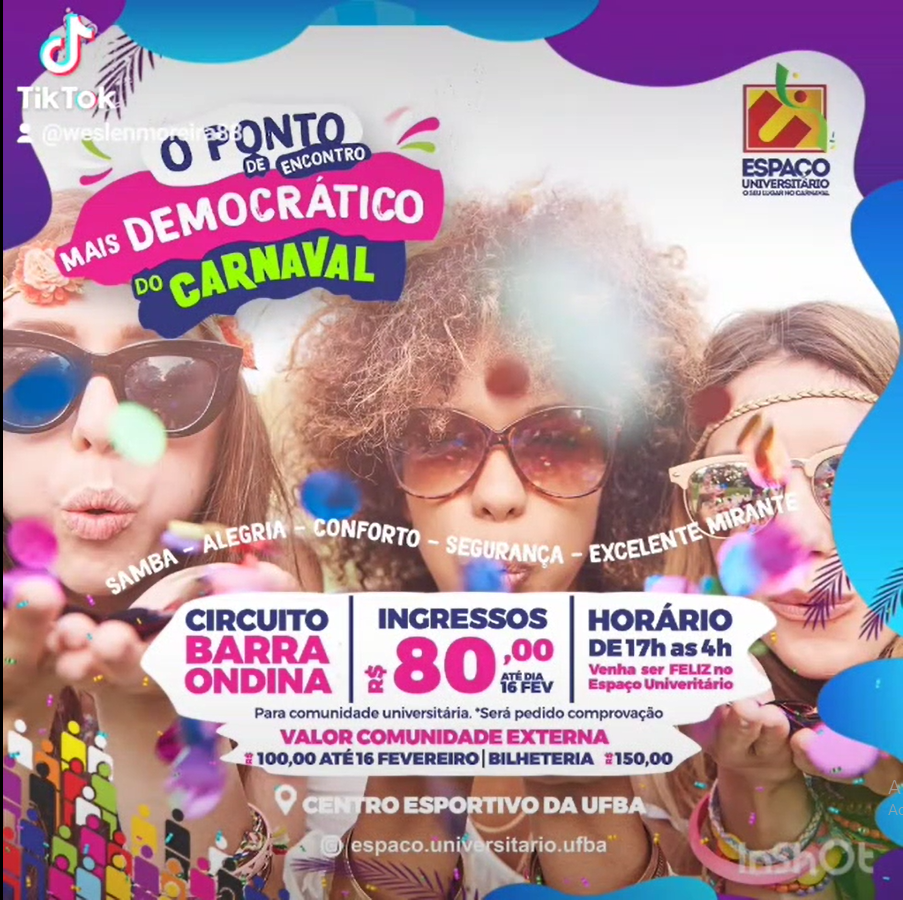 A comunidade universitária também tem uma excelente oportunidade para curtir a folia pagamento muito pouco. Apenas R$ 80,00 (dia) para entrar. Para os demais públicos, a entrada é R$ 100,00. Mas, é bom se ligar. A promoção só vai até esta quinta-feira (16/02). É só acessar o link para compra: https://vendas.ticketmaker.com.br/?ct=2197&cl=305