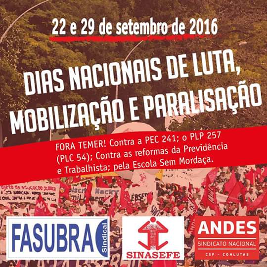 A mobilização servidores públicos e trabalhadores da iniciativa privada (sindicato dos metalúrgicos) também será pelo FORA TEMER, rumo à greve geral! Em defesa da educação pública!