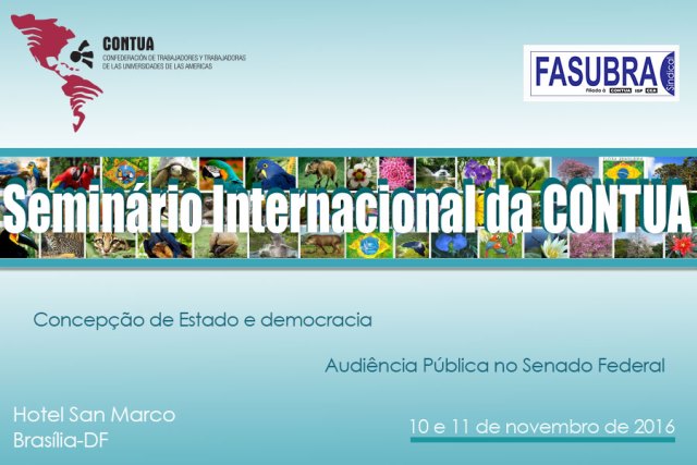 O Brasil sediará nos dias 10 e 11 de novembro em Brasília-DF, o Seminário Internacional sobre Concepção de Estado e Democracia e a Reunião do Conselho Executivo da Confederação de Trabalhadores e Trabalhadoras das Universidades da América (CONTUA) em conjunto com a FASUBRA Sindical.