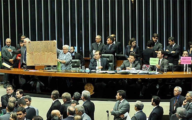 “Essa história de ser ao mesmo tempo presidente da Câmara e líder do governo não é algo que seja razoável”, criticou o líder do Psol, Glauber Braga (RJ), referindo-se a Rodrigo Maia. O partido apresentou recurso para que a matéria não seja votada, afirmando ter o mínimo necessário de um terço dos deputados presentes, mas Maia ignorou o pedido e encaminhou a votação do requerimento de urgência. Parte dos parlamentares subiu até a mesa para pressioná-lo, gritando “golpe”.