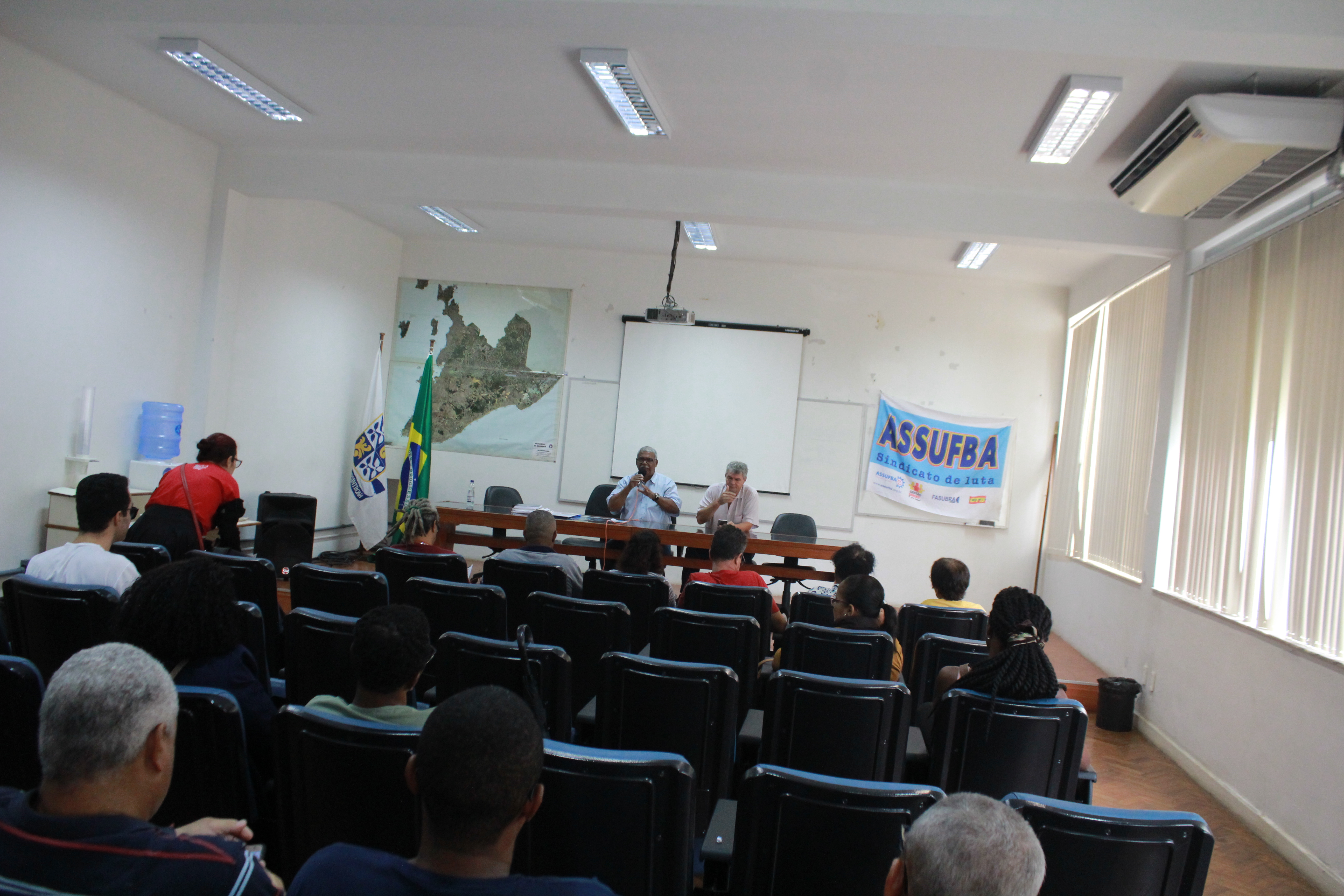 Na manhã desta quarta-feira (27/11), foi realizado o segundo dia da Greve Nacional de 48h. As movimentações começaram com ato na Maternidade Climério de Oliveira (COM) e seguiu com a realização de uma Frente Ampla em Defesa dos Serviços Públicos, na Faculdade de Economia da UFBA. A Carta Aberta à População foi lida aos servidores e demais segmentos da educação presentes e logo em seguida foi aberto o espaço para discussão do atual cenário político do país. A Coordenação da ASSUFBA, Técnico-Administrativos ativos e aposentados, além do Diretor da Faculdade de Economia, Prof. Henrique Tomé, estiveram presentes neste grande ato.