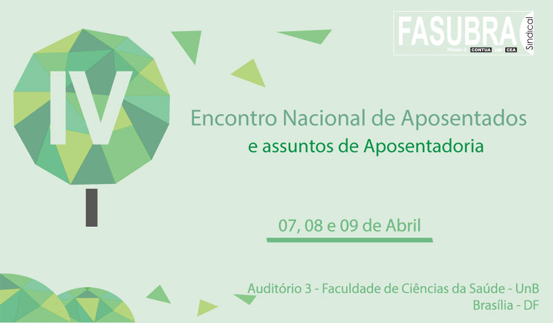 A Coordenação de Aposentados e Assuntos de Aposentadoria convida a todos os aposentados, pensionistas e futuros aposentados dos sindicatos de base filiados à Fasubra para participarem do IV Encontro Nacional de Aposentados e Assuntos de Aposentadoria, a ser realizado nos dias 7, 8 e 9 de abril, na Faculdade de Ciências da Saúde da Universidade de Brasília – DF.