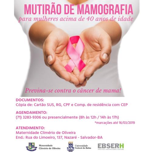 A Maternidade Climério de Oliveira, em homenagem ao mês da mulher, realiza mutirão de monografias para mulheres acima dos 40 anos. São 30 vagas por dia, desta quinta-feira (07/03) até o dia 16 de março. O atendimento acontece de segunda a sábado.