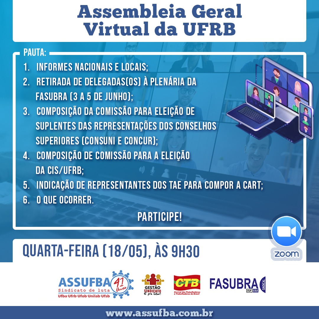 Acontece nesta quarta-feira (18/05), às 9h30, a Assembleia Geral Virtual com os servidores da UFRB. Na atividade serão retirados os(as) delegados(as) à Plenária Nacional da FASUBRA. A pauta inclui também informes nacionais e locais; composição da comissão para eleição de suplentes das representações dos conselhos superiores (Consuni e Concur); composição de comissão para a eleição da CIS/UFRB; indicação de representantes dos TAE para compor a CART; e o que ocorrer.