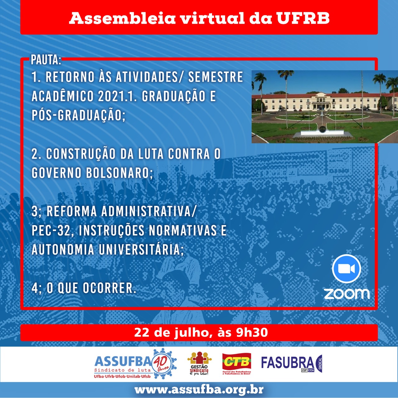 Nesta quinta-feira (21/07) tem Assembleia Geral Virtual com os servidores da UFRB