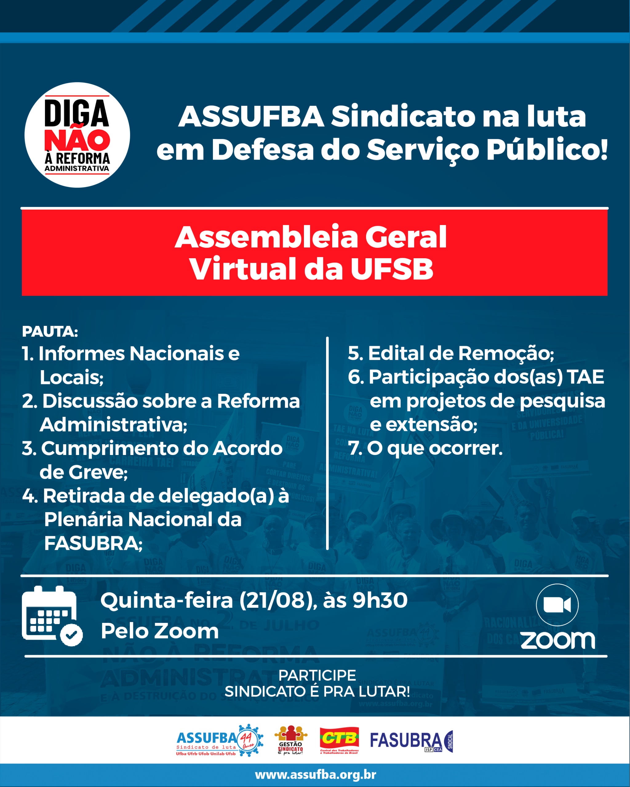 Os(as) servidores(as) da UFSB têm um compromisso marcado nesta quinta-feira (21/08). Participar da Assembleia Geral Virtual, às 9h30. A voz de cada trabalhador(a) é arma poderosa para impedir retrocessos e conquistar avanços.