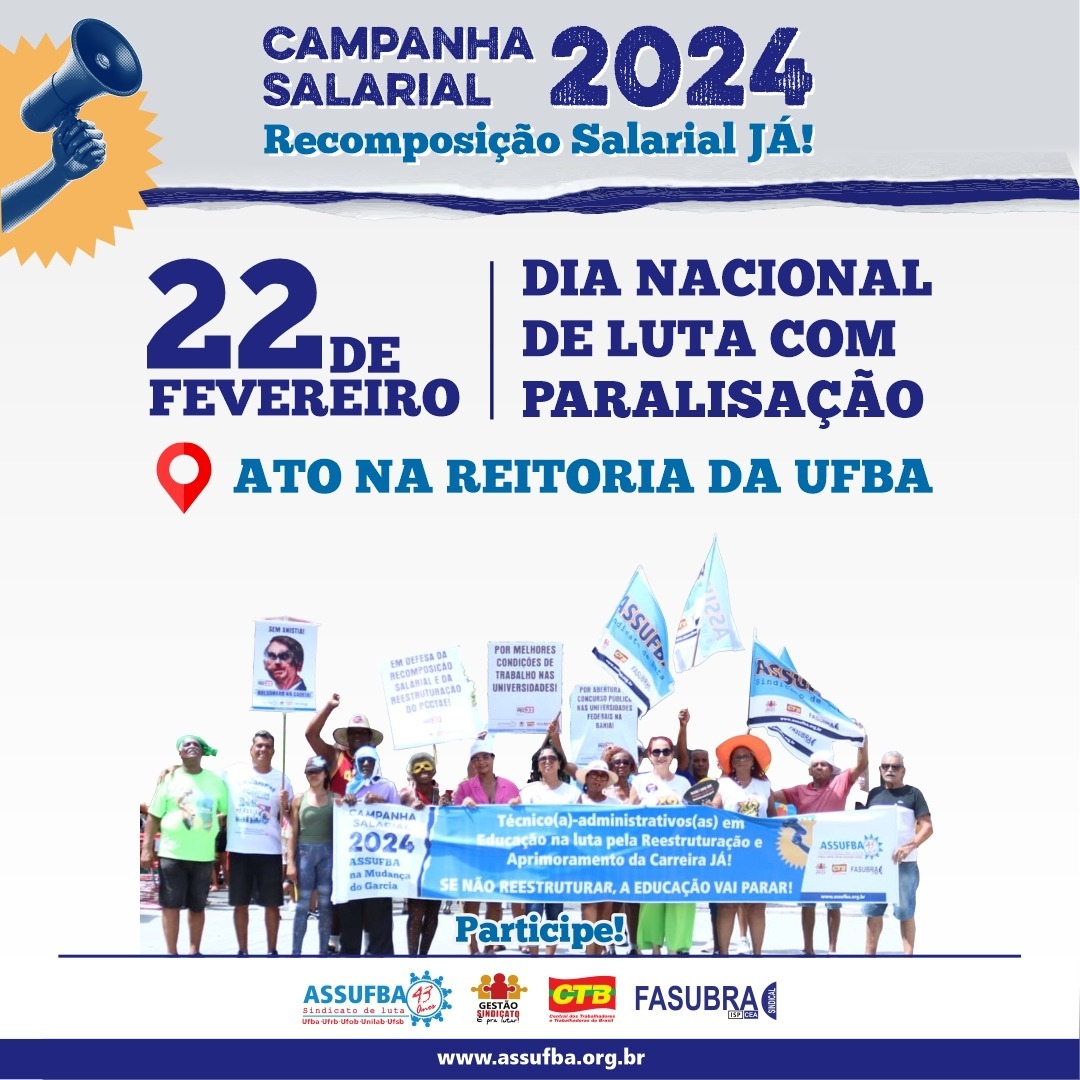 NESTA QUINTA-FEIRA (22/02) SERVIDORES(AS) TAE DA UFBA SE UNEM NO DIA NACIONAL DE LUTA COM PARALISAÇÃO