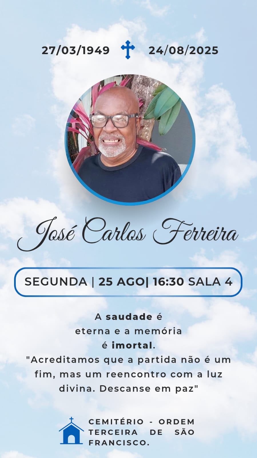 O sepultamento acontece nesta segunda-feira (25/08), às 16h30, no Cemitério da Ordem Terceira de São Francisco, Sala A.