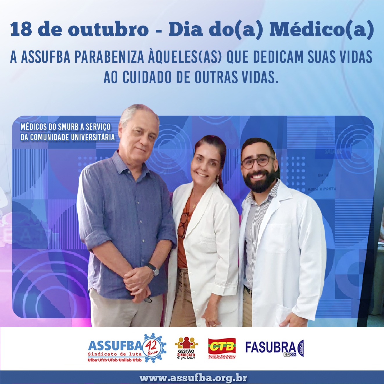 Devemos sempre lembrar e celebrar o acesso à saúde e a qualidade dos(as) profissionais. Nós da ASSUFBA Sindicato enviamos um parabéns especial aos médicos(as) do SMURB, COM-HUPES E MCO que com carinho e profissionalismo cuidam da comunidade universitária e do povo em geral.