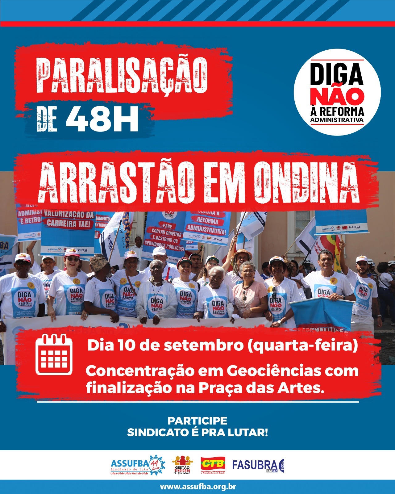 Na próxima quarta-feira (10/09), a ASSUFBA Sindicato convoca a categoria Técnico-Administrativo em Educação da UFBA para o Arrastão em Ondina, como parte da Paralisação de 48h, orientada pela FASUBRA.