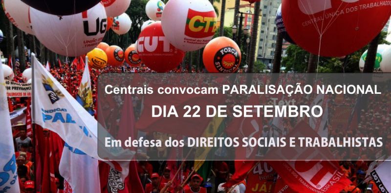 Após reunião realizada na tarde de sexta-feira (09/09), as centrais sindicais (CTB, CUT, FORÇA SINDICAL, UGT, NOVA CENTRAL E INTERSINDICAL) anunciaram a realização de paralisação nacional no próximo dia 22 de setembro. A reunião, que ocorreu na sede da CUT Nacional, deliberou a convocação geral da classe trabalhadora em protesto contra as medidas anunciadas pelo governo sem voto de Michel Temer, que sinaliza para a implementação de uma agenda ultraneoliberal.