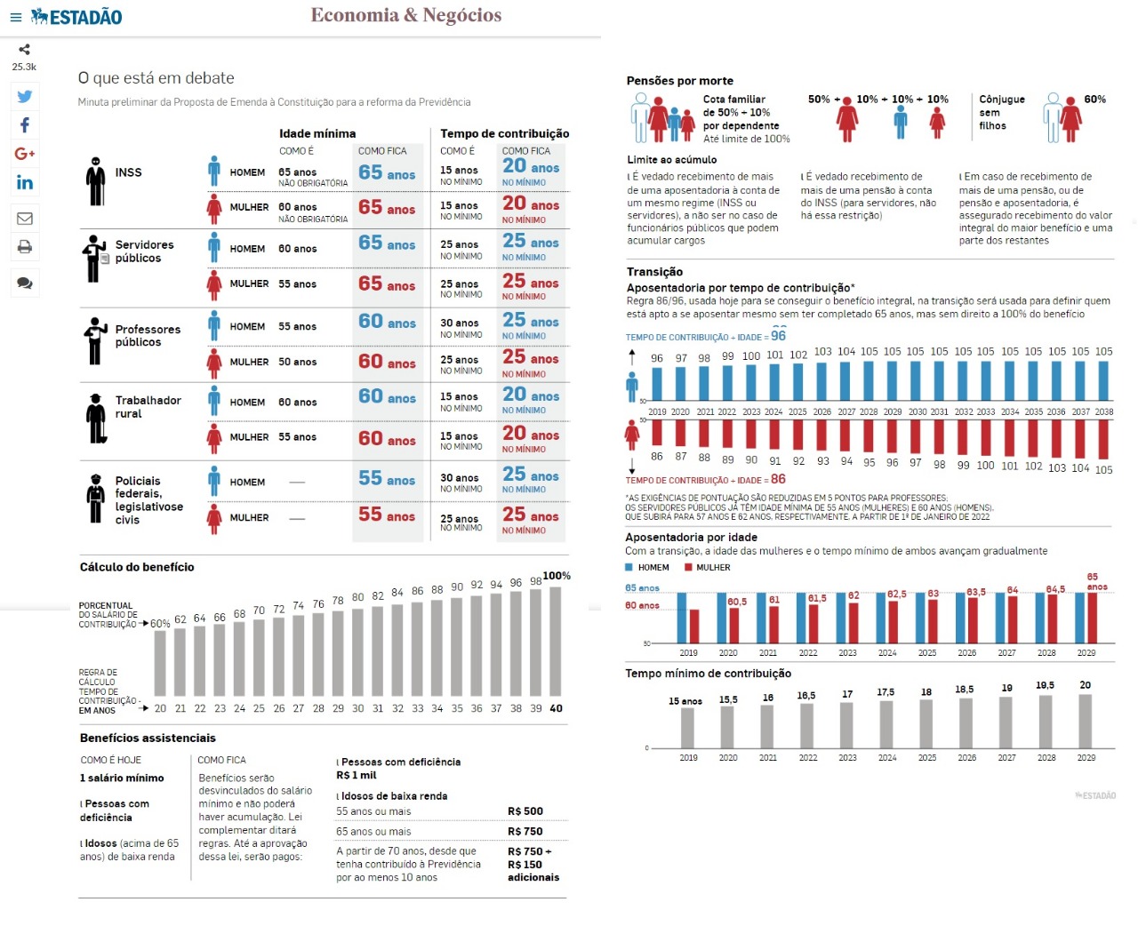 A regra vale tanto para o INSS quanto para o regime dos servidores públicos, embora o tempo mínimo de contribuição a ser exigido seja diferente. Enquanto no INSS será de 20 anos, para o funcionalismo seria de 25 anos. Para professores, que, pela proposta, seriam contemplados com idade mínima menor (60 anos), a exigência seria de 30 anos de contribuição.