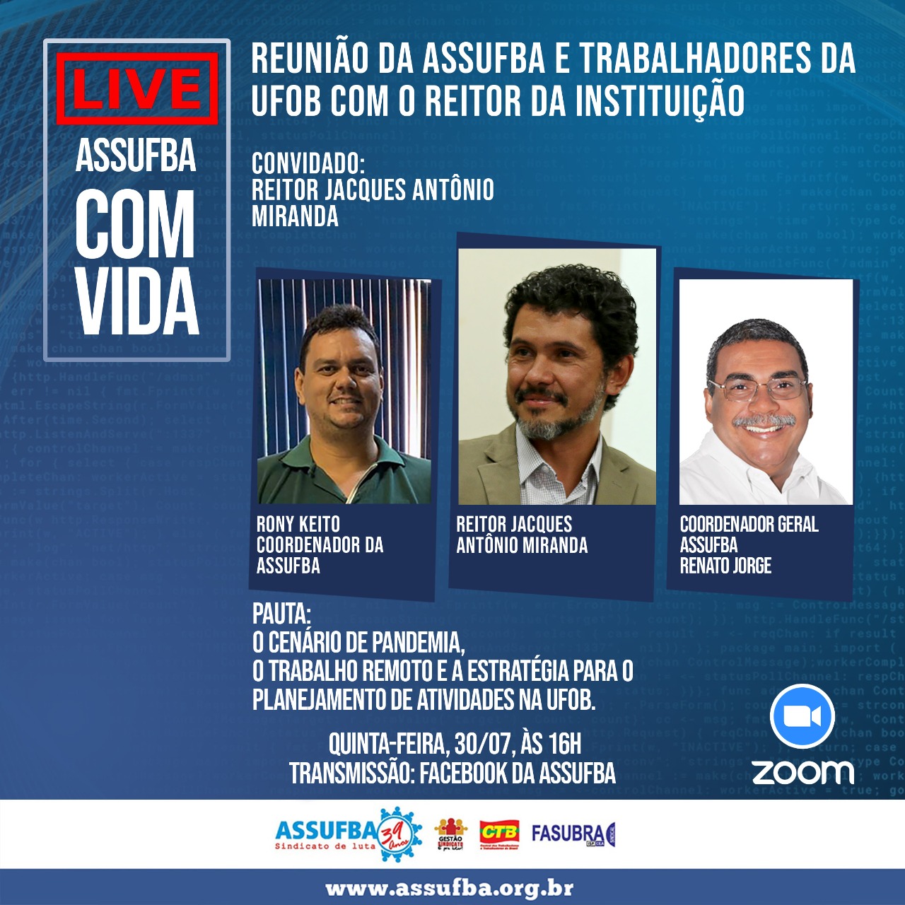 É nesta quinta-feira (30/07), a próxima edição do ASSUFBA Com Vida. O convidado é o reitor da UFOB, Jacques Antônio Miranda. O encontro virtual acontece às 16h e será transmitido pelo Facebook do Sindicato.
