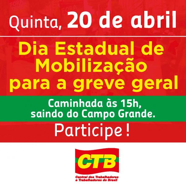 As atividades do Dia Estadual de Luta não devem se restringir à Salvador. A CTB orienta que os sindicatos do interior do estado também organizem, no dia 20 de abril, caminhadas, plenárias e outras atividades em locais públicos para convocar a população para participar da greve do dia 28.