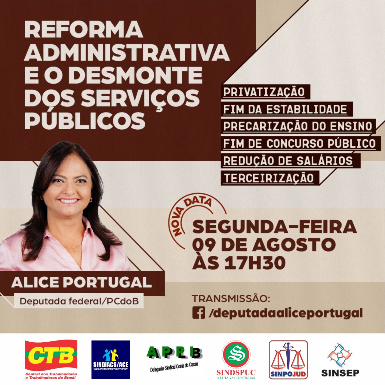 Para debater esse assunto, a gente te convida para uma live com a Deputada Federal Alice Portugal (PCdoB), hoje (9/8). A discussão começa às 17h30, com a presença dos sindicatos do funcionalismo público da região. Não perca!