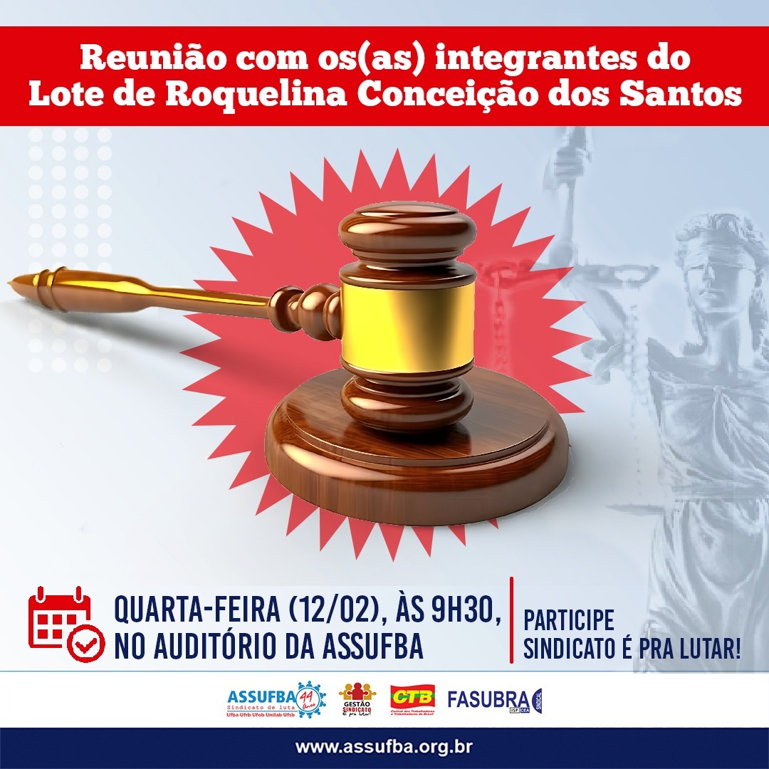 A ASSUFBA realiza reunião, na próxima quarta-feira (12/02), às 9h30, com os(as) integrantes do Lote de Roquelina Conceição dos Santos, referente ao processo das 30 Horas. O encontro acontece no Auditório do Sindicato.
