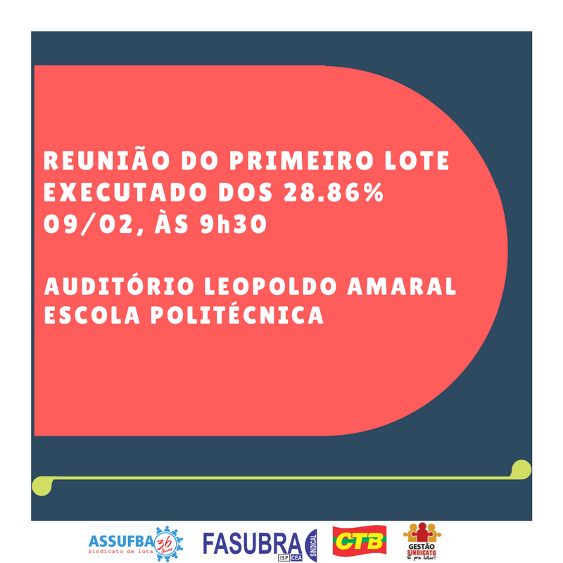 A Assufba convoca os servidores do primeiro lote executado dos 28.86% para reunião, no dia 09/02, às 9h30, no auditório Leopoldo Amaral, na Escola Politécnica.