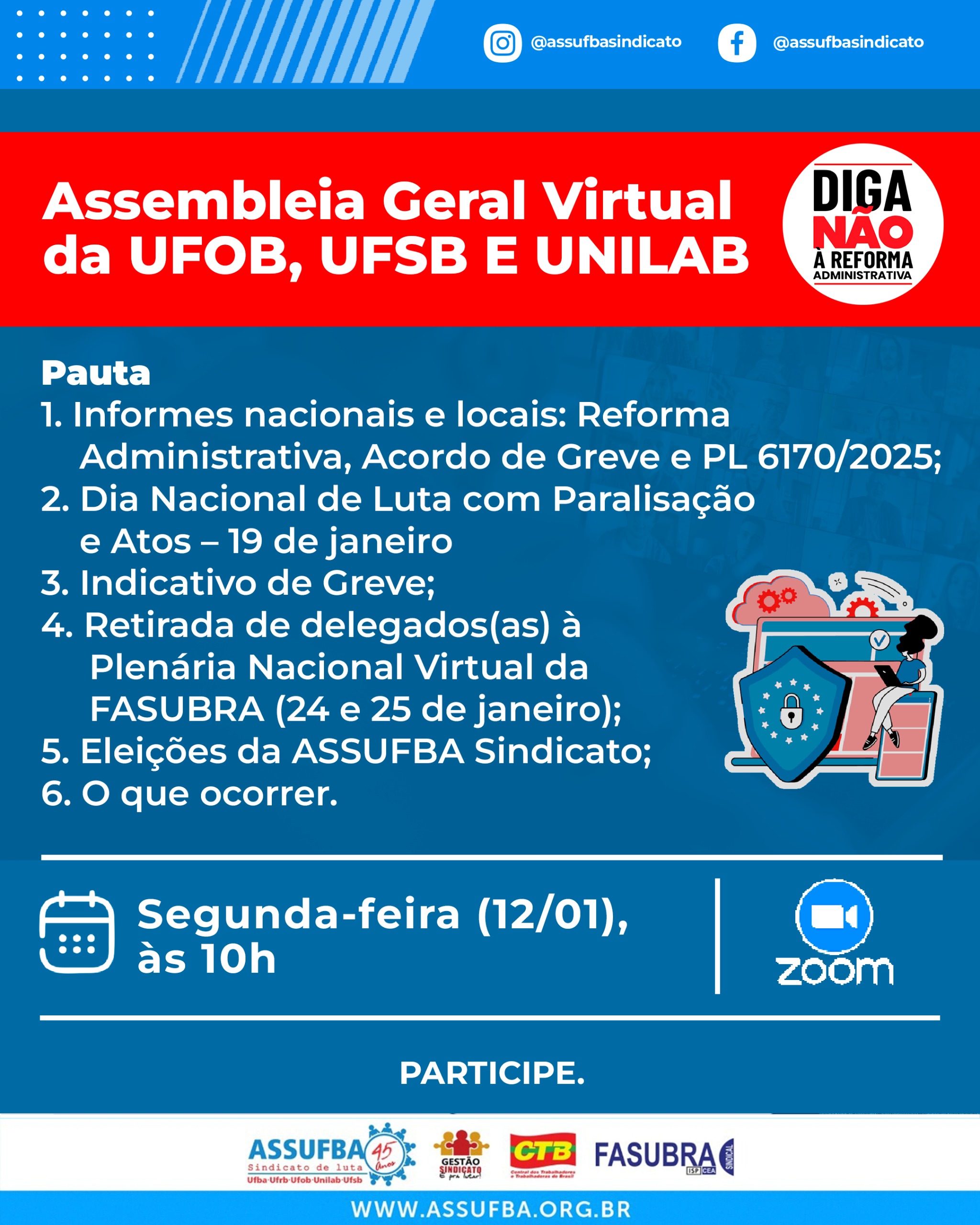 A ASSUFBA convoca os(as) servidores(as) da UFOB, UFSB e UNILAB para a Assembleia Geral Virtual, que acontece na segunda-feira (12/01), às 10h. A atividade é um espaço estratégico de debate, informação e decisão diante dos desafios que atravessam o serviço público e a educação.