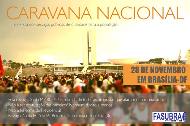 Milhares de servidores públicos prometem ocupar a Esplanada dos Ministérios em Brasília-DF, com caravanas de todo o país, no dia 28 de novembro. A FASUBRA Sindical engrossa as fileiras de mobilização em defesa do serviço público, contra os ataques ao funcionalismo e em defesa da Carreira e Educação Pública.