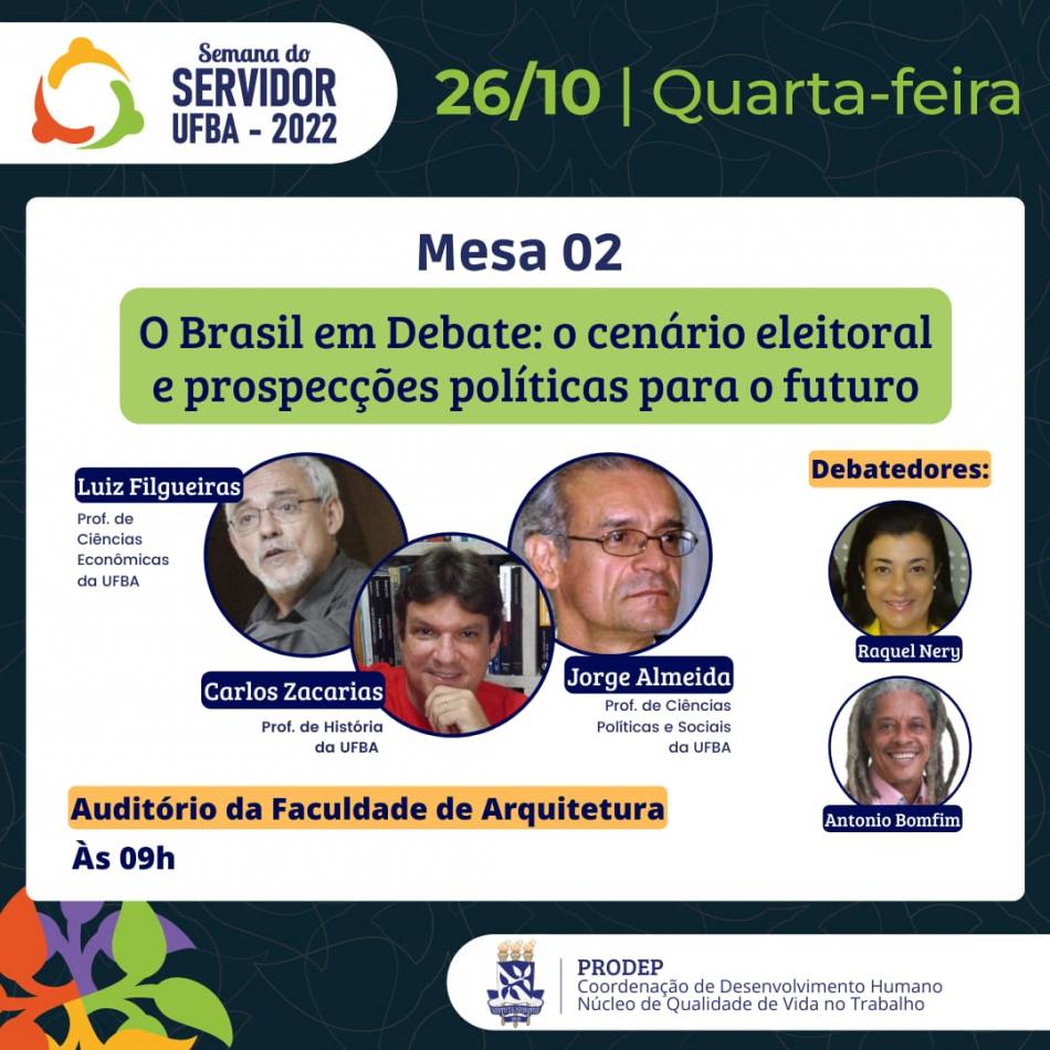 Como parte da programação da Semana do Servidor da UFBA, nesta quarta-feira (26/10), às 9h, no auditório da Faculdade de Arquitetura, acontece a mesa “Brasil em debate: o cenário eleitoral e prospecções políticas para o futuro”.
