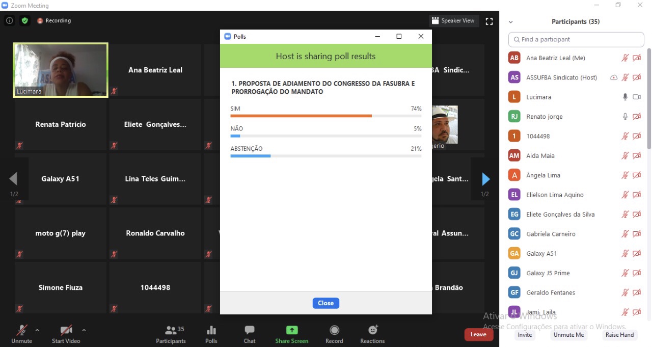 Os servidores da UFRB também fizeram o debate sobre a proposta encaminhada pela FASUBRA de adiamento ou não do XXIV CONFASUBRA e prorrogação do mandato da direção e do Conselho Fiscal da Federação. Do total de técnicos da instituição que votaram, 74% foram a favor, 5% contra e 21% se abstiveram.