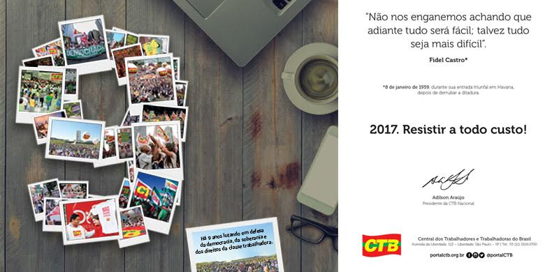 Para celebrar este momento desafiador para toda a classe trabalhadora brasileira, a CTB lembra as palavras do eterno comandante Fidel Castro: “Não nos enganemos achando que adiante tudo será fácil; talvez tudo seja mais difícil”. E para 2017, a mensagem é resistir a todo custo. Vida longa à CTB!
