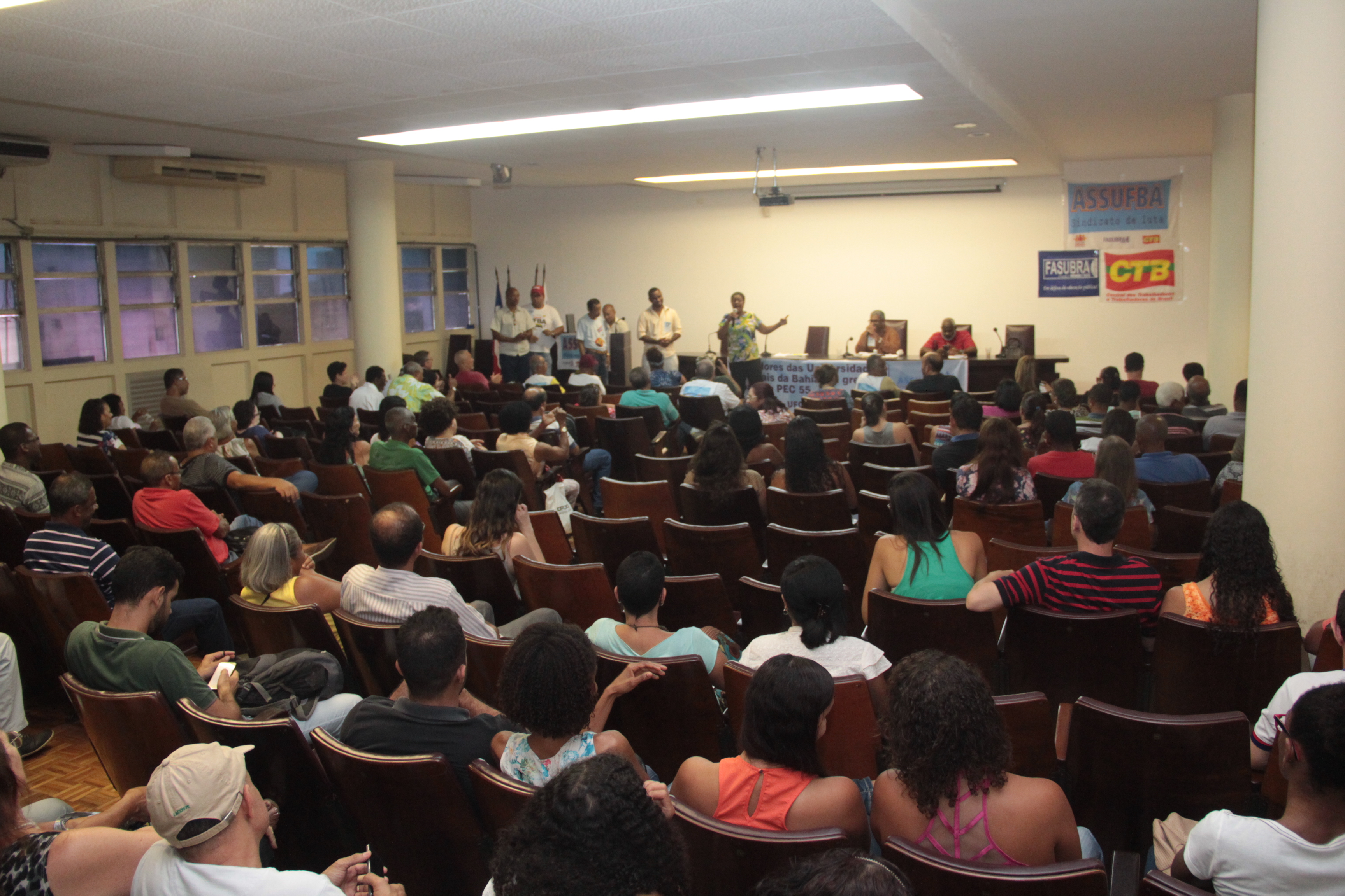 Além da deliberação da manutenção da greve contra a PEC 55, a assembleia dos técnico-administrativos em Educação da UFBA, que aconteceu nesta quinta-feira (17/11), na Escola Politécnica, aprovou, por unanimidade, o calendário de ações para fortalecimento do movimento paredista. O coordenador geral da Assufba, Renato Jorge, iniciou a atividade relatando as últimas ações do Comando Local de Greve para ampliar o engajamento da categoria e da população contra a Proposta de Emenda à Constituição que devasta o serviço público e áreas fundamentais para o país como saúde e educação.