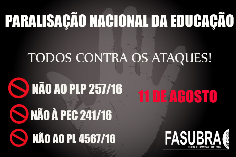 Conforme aprovado na Plenária Nacional da FASUBRA no mês de junho último, os trabalhadores Técnico-Administrativos em Educação das instituições federais de ensino de todo o país estão sendo convocados a aderir à PARALISAÇÃO NACIONAL DA EDUCAÇÃO, como forma de organizar a resposta aos ataques representados pelo PLP 257/2016 e PEC 241/2016 aos direitos dos servidores públicos e à sociedade brasileira.