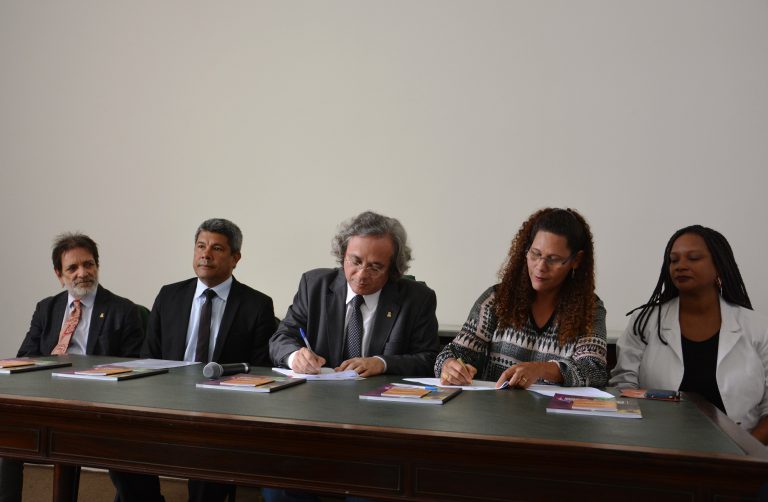 Unir forças para combater o racismo e desenvolver políticas para ampliar a igualdade étnico-racial é o objetivo do termo de cooperação firmado entre a UFBA e o Governo do Estado na última quarta-feira, 19/04, em cerimônia realizada no prédio da reitoria. O reitor João Carlos Salles e os titulares do governo das secretarias de Promoção da Igualdade Racial (Sepromi), Fabya Reis, e de Desenvolvimento Rural (SDR), Jerônimo Rodrigues, assinaram o acordo, cuja vigência é de dois anos.