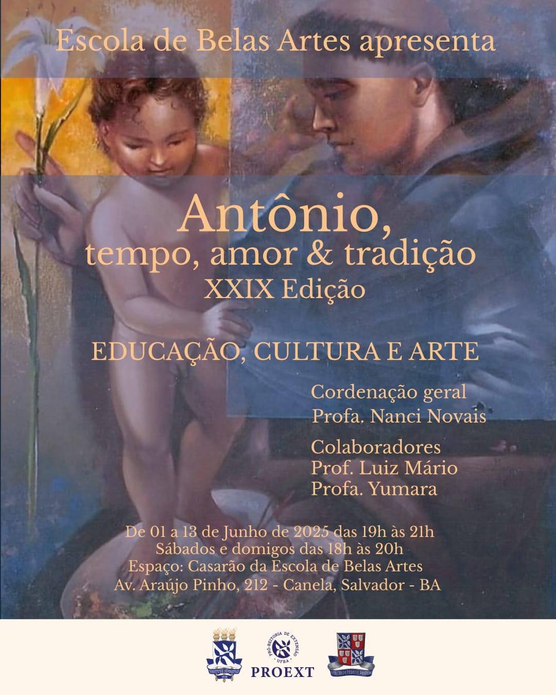 A partir de 1º de junho, a 13ª Noite “Antônio, Tempo, Amor e Tradição” marca a XXIX edição de uma celebração religiosa na escola de belas artes da UFBA. A abertura acontece às 18h. As demais noites seguem sempre às 19h. O espaço contará com estacionamento fechado.