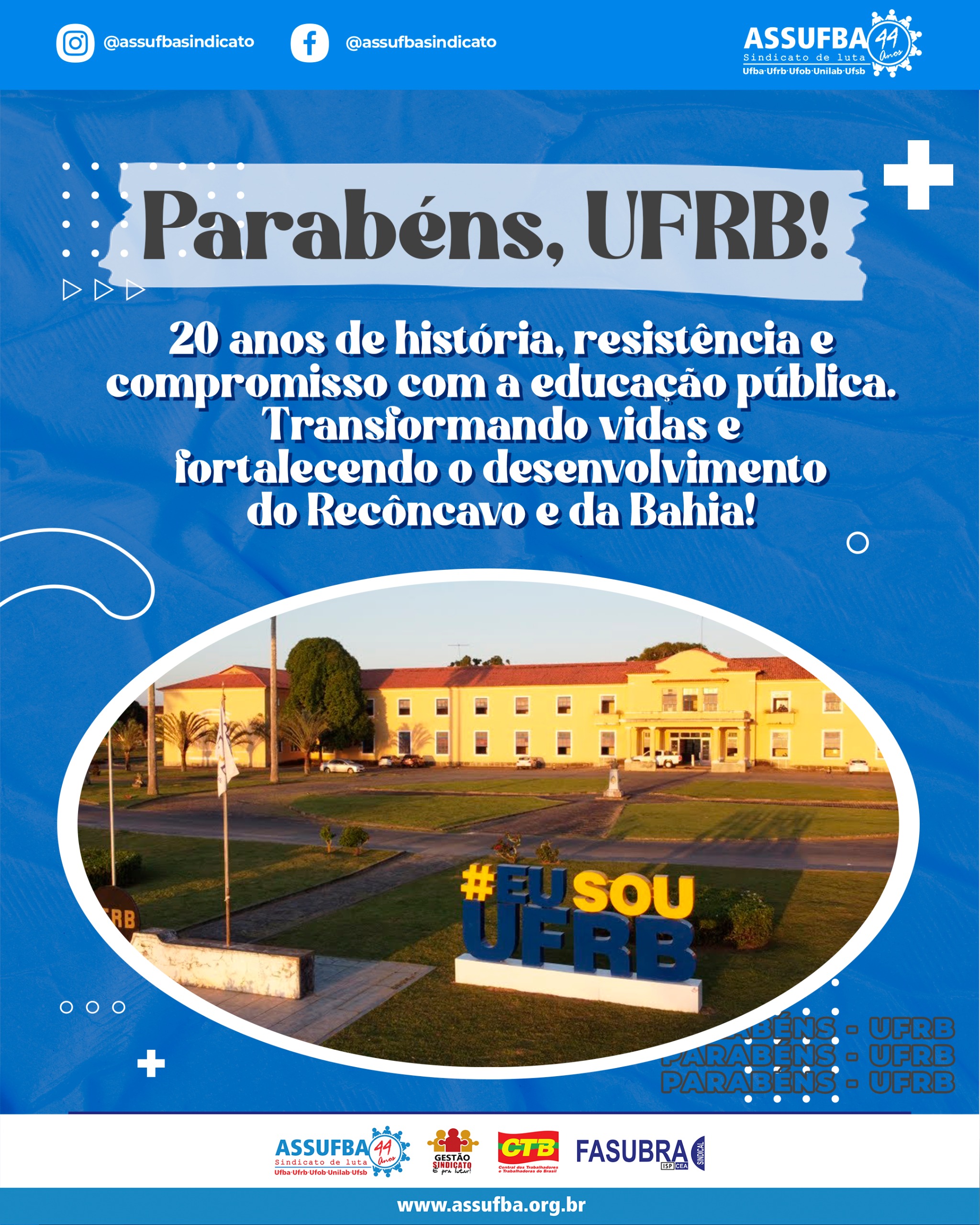 A ASSUFBA, junto com a Comunidade Universitária, PARABENIZA a Universidade Federal do Recôncavo da Bahia pelos 20 anos de história, completados no dia 29 de julho. A celebração pelas duas décadas democratizando o acesso ao ensino superior público, gratuito, de qualidade, formando mais de 15 mil egressos, acontece nesta terça-feira (19/08), durante o “Seminário Território, Universidade e o Futuro do Desenvolvimento”.