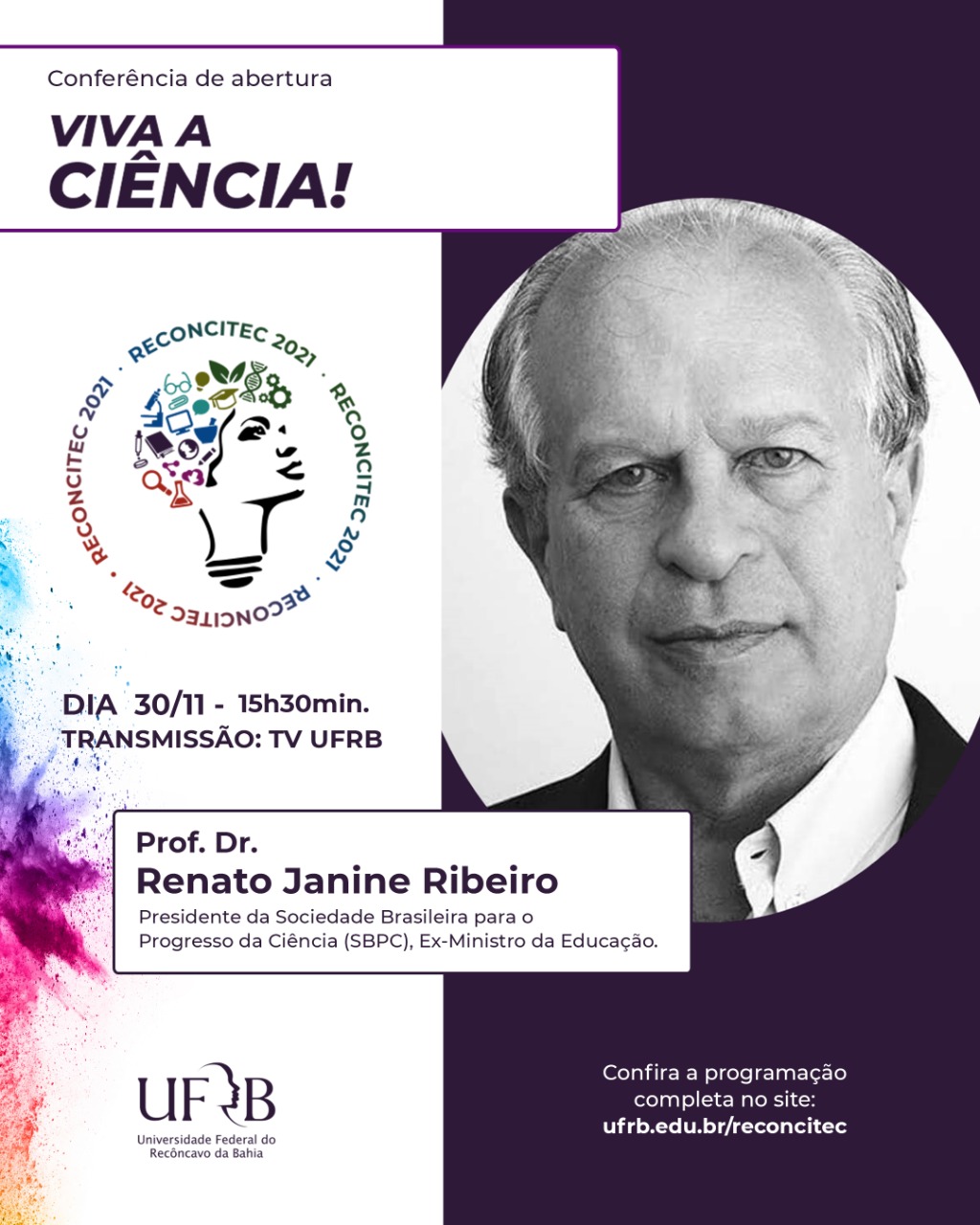 O palestrante da conferência de abertura da Reconcitec 2021 será o ex-ministro da Educação, professor sênior do Departamento de Filosofia da Faculdade de Filosofia e ainda Presidente da Sociedade Brasileira para o Progresso da Ciência (SBPC), Renato Janine Ribeiro. “Talvez as pessoas valorizassem mais a ciência se tivessem uma noção mais clara do quanto devem à ciência”, disse em entrevista à Revista Pesquisa FAPESP.