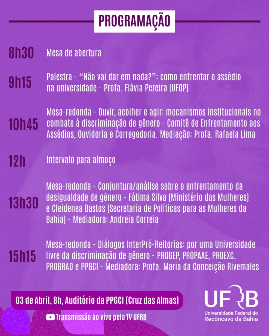 A Universidade Federal do Recôncavo da Bahia (UFRB) realiza, no dia 3 de abril, o I Seminário de Enfrentamento da Discriminação de Gênero da UFRB, com o objetivo de debater e conscientizar sobre a discriminação de gênero no contexto universitário. O evento acontecerá no auditório da Pró-Reitoria de Pesquisa, Pós-Graduação, Criação e Inovação (PPGCI), no campus Cruz das Almas, com transmissão ao vivo pela TV UFRB. A programação contará com a presença de autoridades e especialistas na área, incluindo a reitora Georgina Gonçalves e representantes de setores responsáveis pelo acolhimento e apuração de denúncias.
