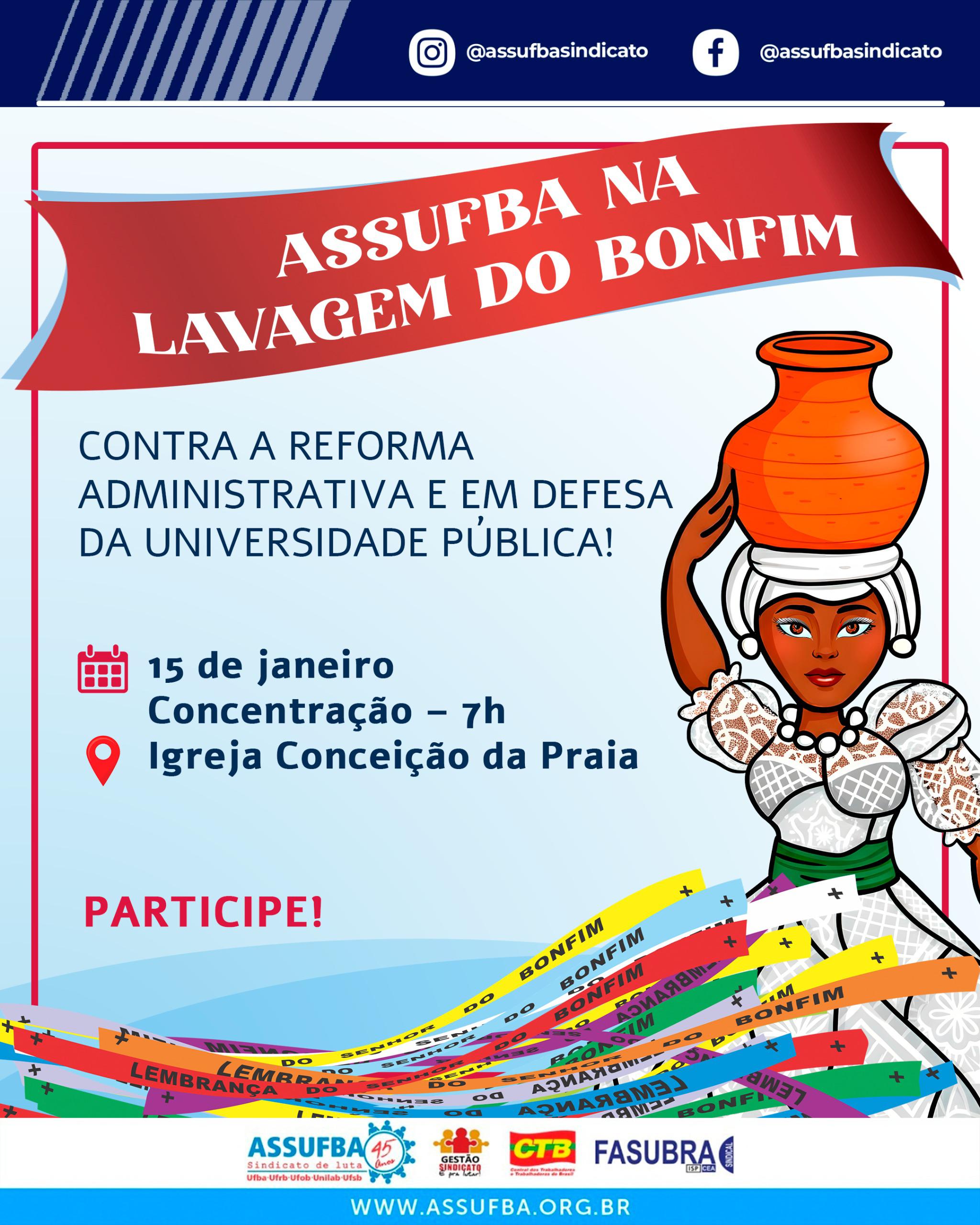No dia 15 de janeiro, a ASSUFBA convoca toda a categoria a caminhar unida na tradicional Lavagem do Bonfim, reafirmando que nossa força nasce da união, da resistência e do compromisso com o serviço público e com a democracia.